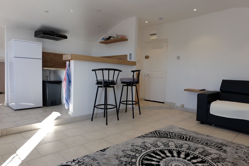 - un salon lumineux avec coin cuisine aménagé